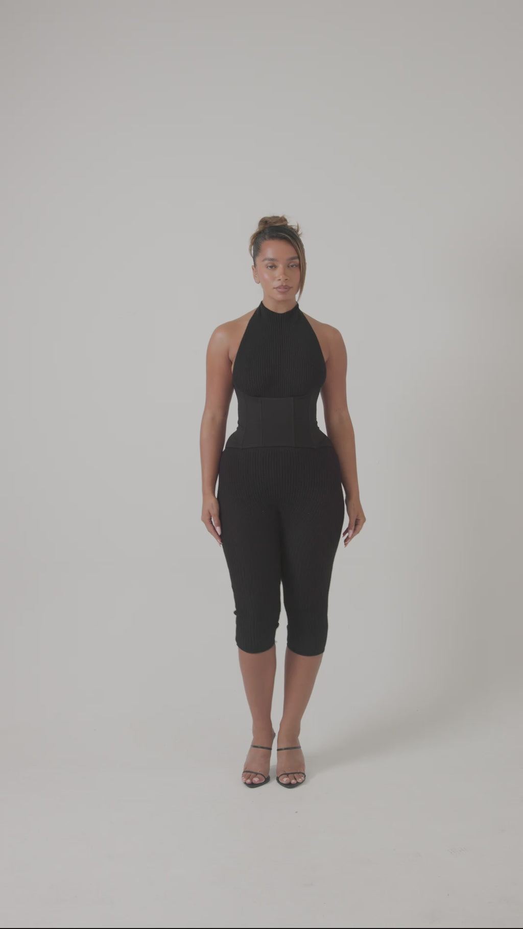 Our Knit halter neck romper capri paired with our detachable corset. Raven allows you to switch between a minimal but effortless to snatched. Giving multiple looks in one.